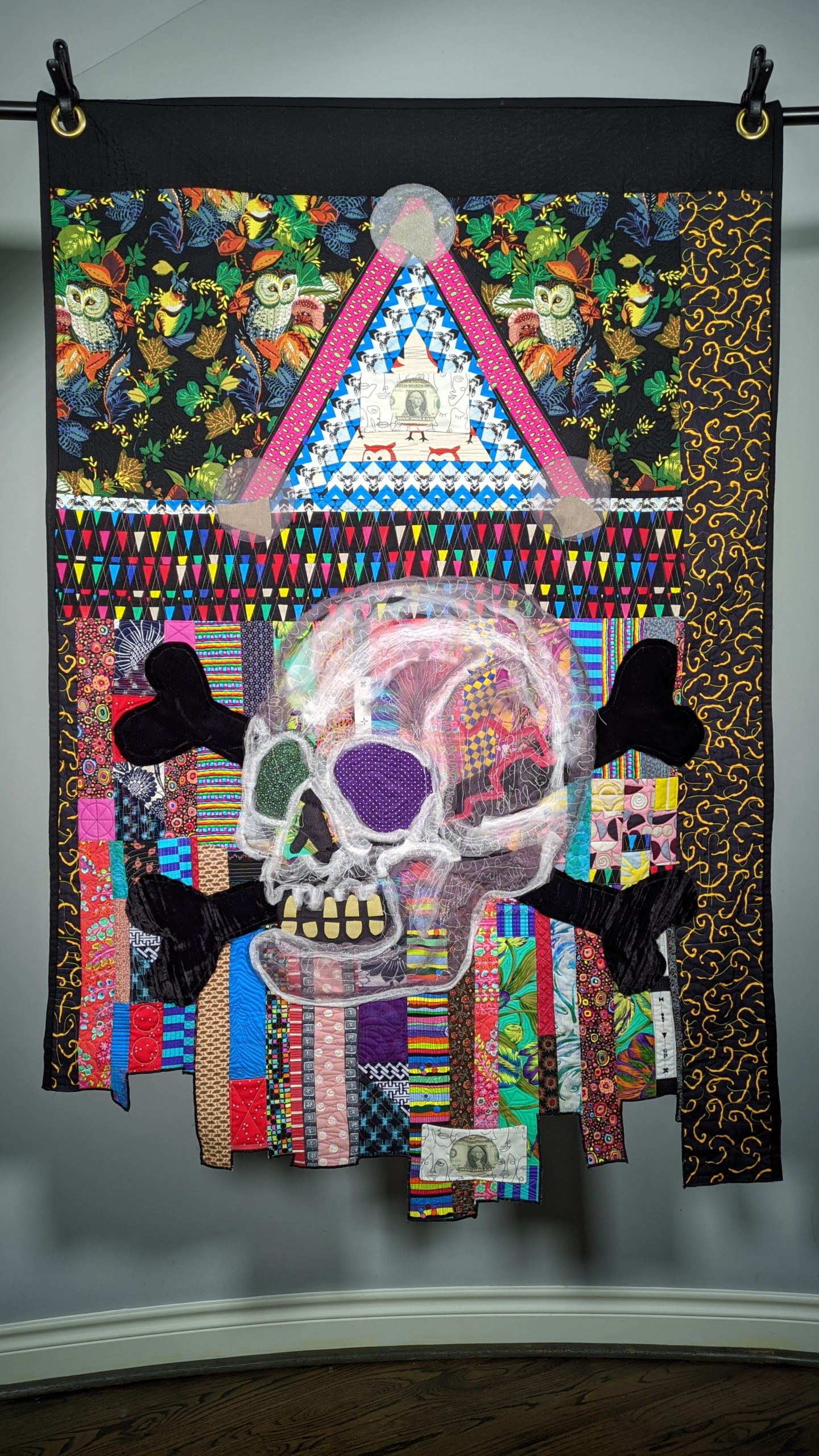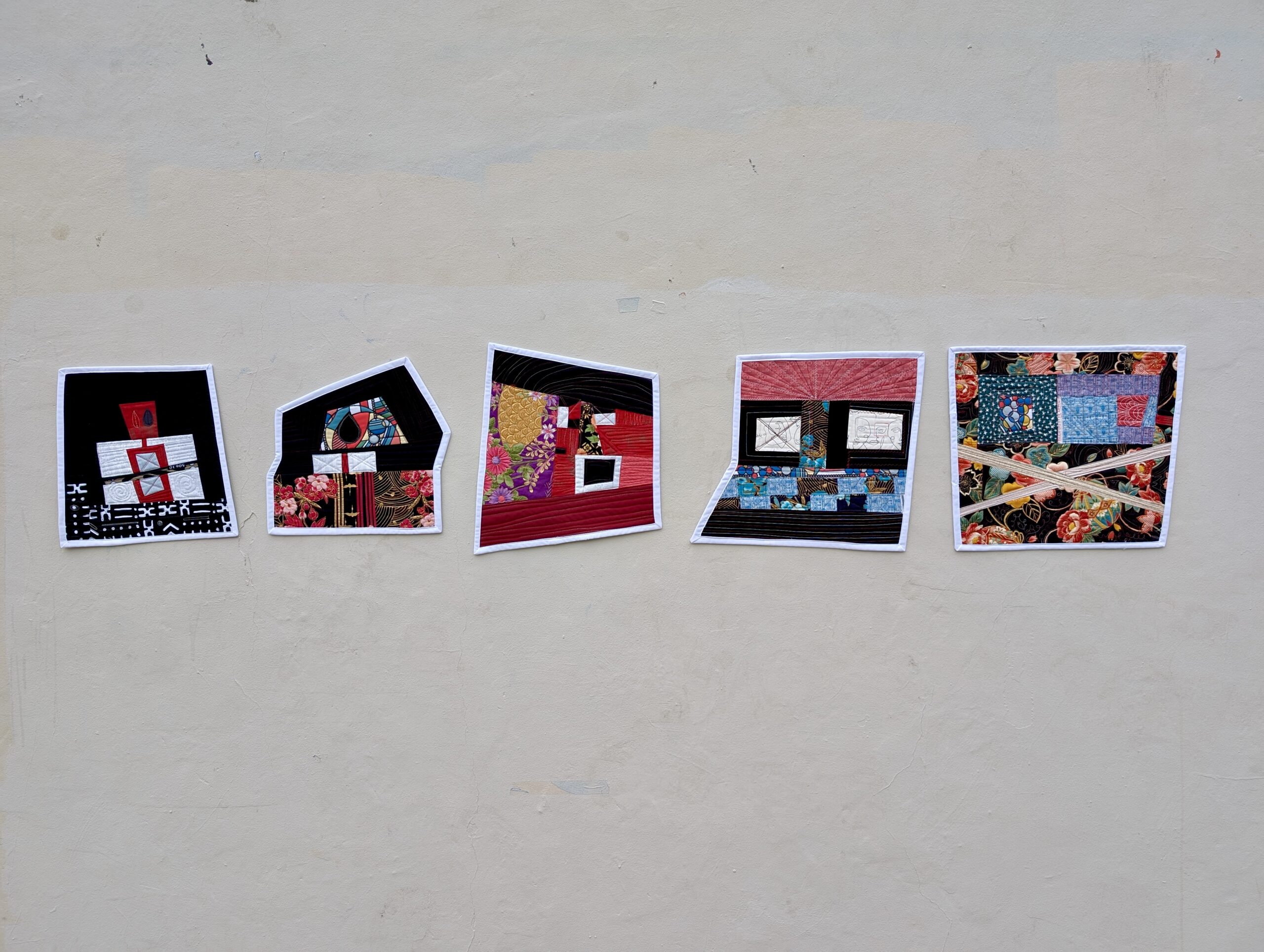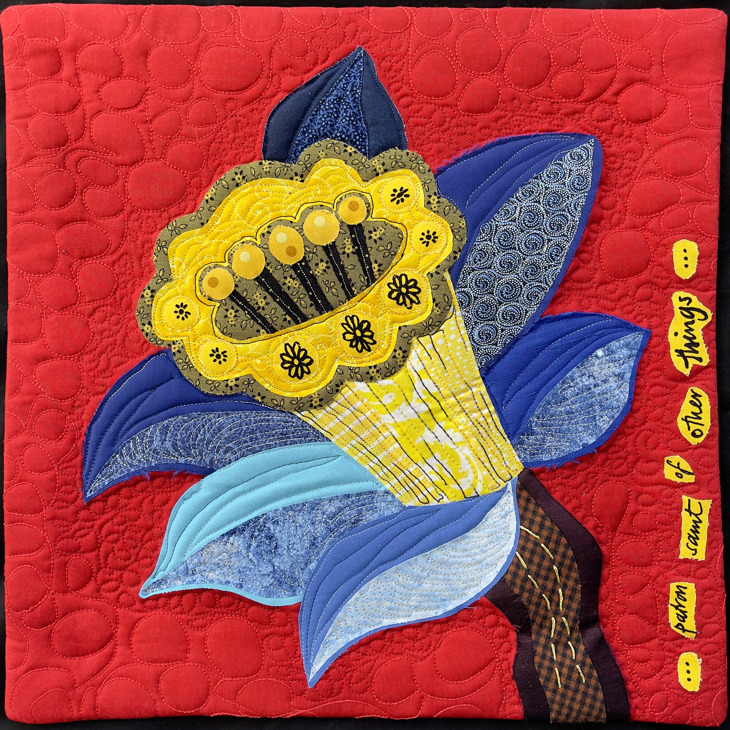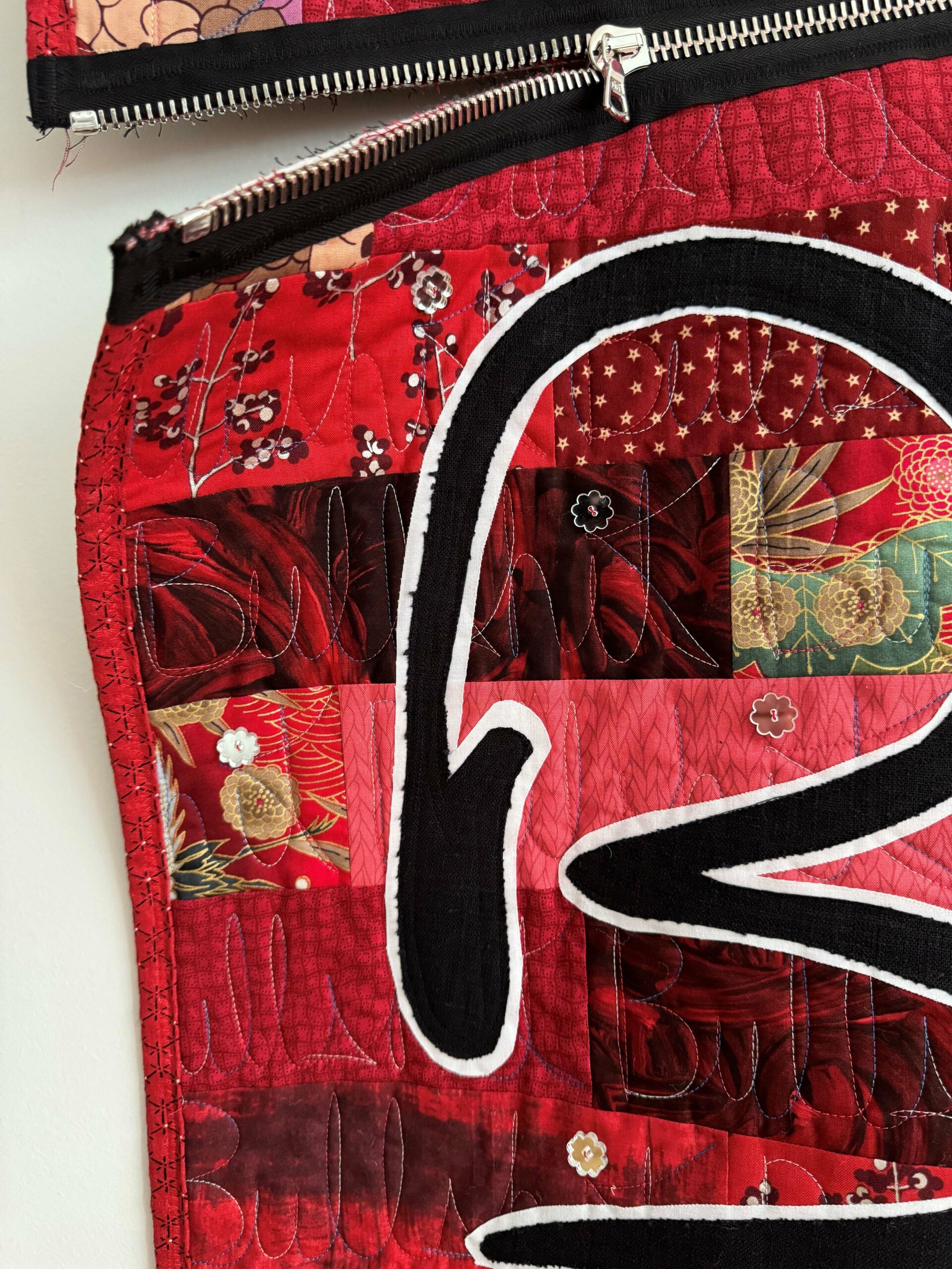 Techniques: piecing, raw edge appliqué, free motion quilting, hand sewing, seam ripping, flanged machine binding.