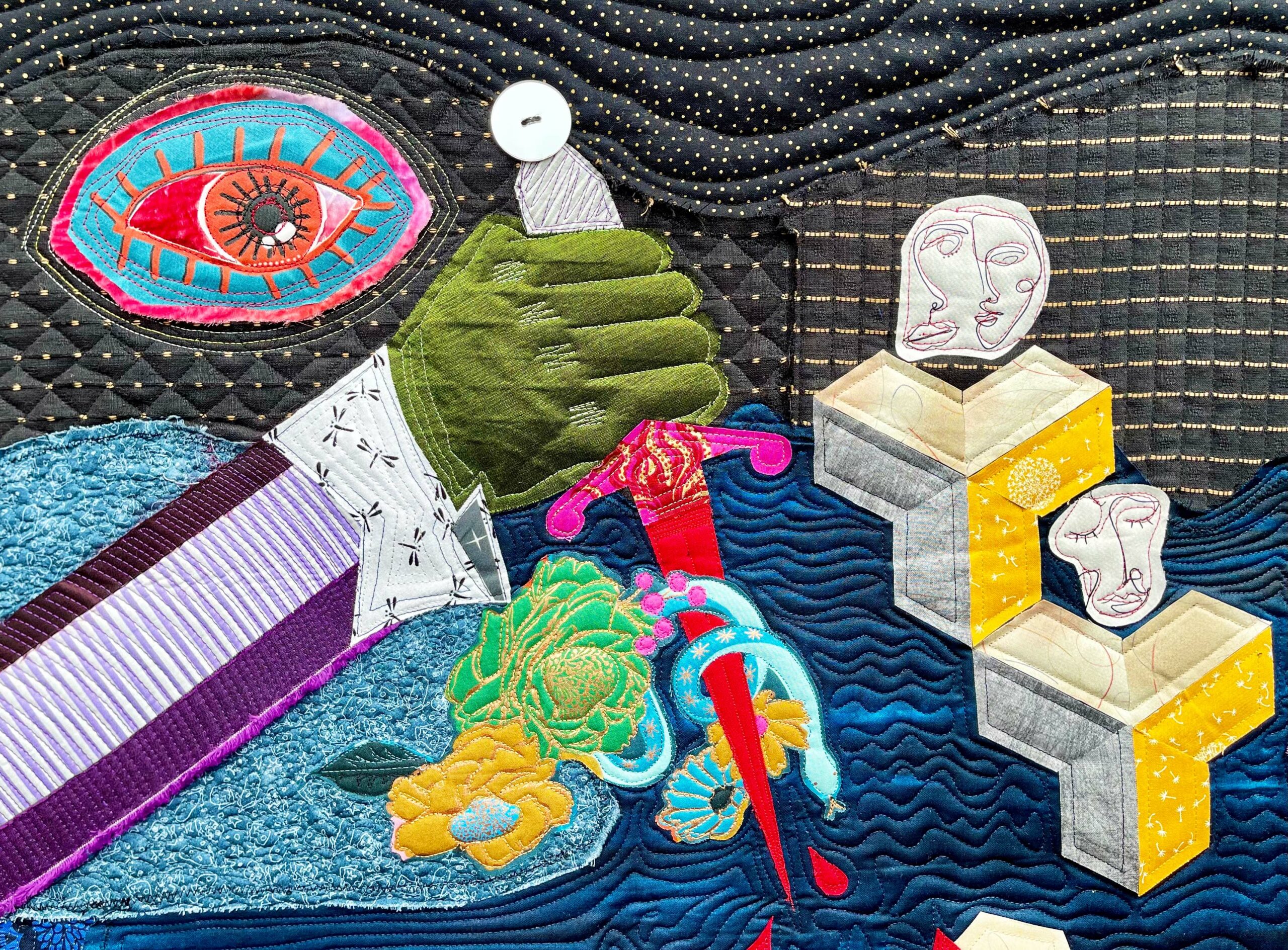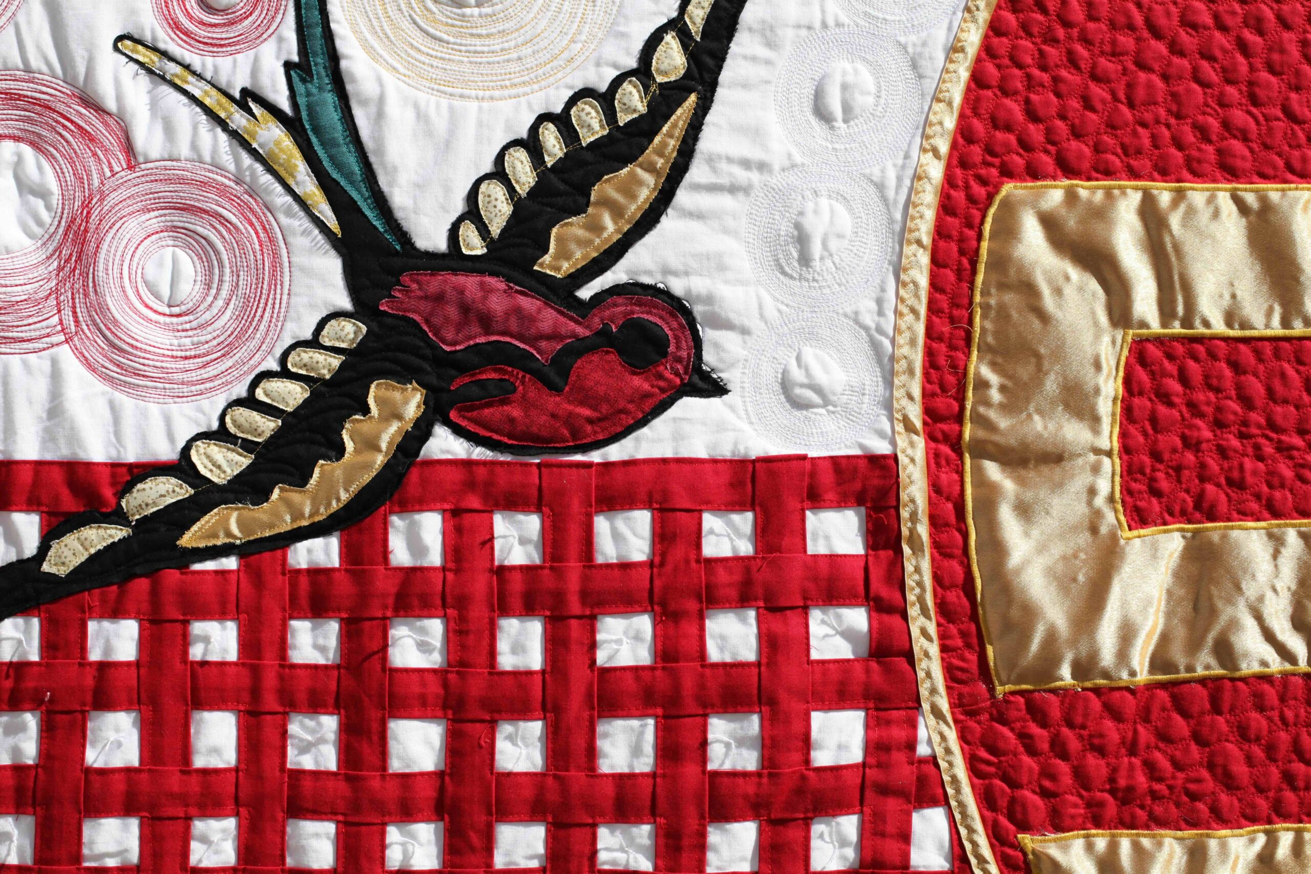 Techniques: raw edge appliqué, tied expanded balanced weaving, free-motion quilting, machine binding.