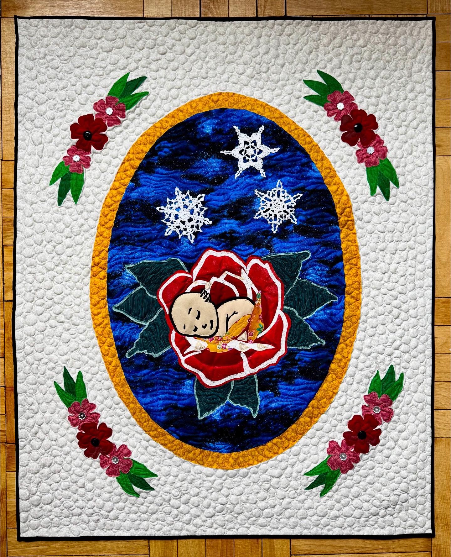 Techniques: raw edge appliqué, hand sewing, free-motion quilting, machine traditional binding.
